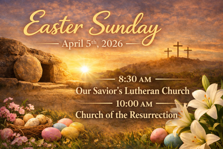 April 5th, 2026, Easter services are held at 8:30 AM at Our Savior's Lutheran Church and 10:00 AM at the Church of the Resurrection. HE IS RISEN!