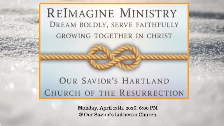 Join both congregations on Monday, April 13th, 2026 at 6:00 PM at Our Savior’s Lutheran Church for ReImagine Ministry as we come together to strengthen our shared mission and grow in Christ.