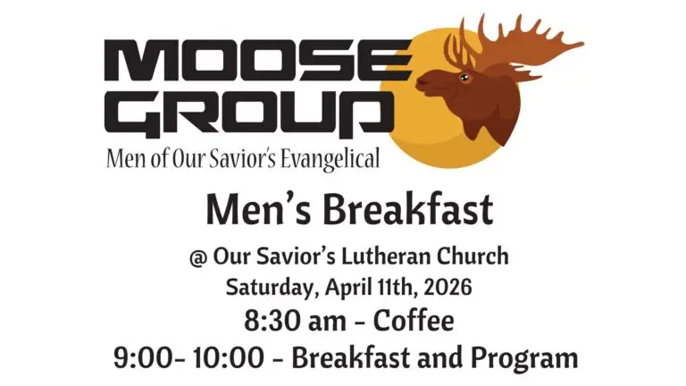 Men of Our Savior’s Evangelical (MOOSE) invite all to breakfast on Saturday, April 11 at 8:30 AM at Our Savior’s. Come hungry and bring a friend!
