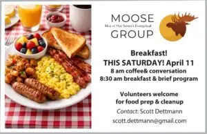 Men of Our Savior’s Evangelical (MOOSE) invite all to breakfast on Saturday, April 11 at 8:00 AM at Our Savior’s. Come hungry and bring a friend!