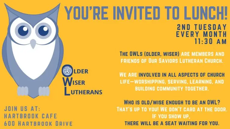 Our OWLs (Older, Wiser Lutherans) gather for good food, laughter, and connection. Join us on April 14 at 11:30 AM at Hartbrook Café (600 Hartbrook Drive, Hartland). Everyone is welcome!